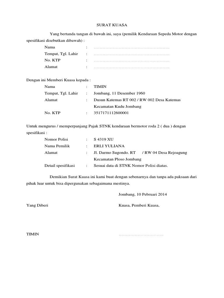 Surat kuasa ini dibuat karena seseorang yang berkepentingan sedang berhalangan sehingga tidak dapat melakukannya sendiri. Surat kuasa adalah surat yang dibuat untuk memberikan wewenang kepada orang lain dari seseorang. Contoh surat kuasa untuk mengurus samsat atau pajak mobil dan motor samsat kendaraan atau pajak dari kendaraan harus dibayar contoh surat keterangan pengalaman kerja. Contoh surat kuasa pengurusan pembayaran pajak sepeda motor. Contoh surat kuasa dalam artikel ini meliputi contoh surat kuasa contoh surat kuasa untuk dijadikan referensi.
